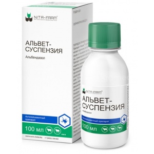 Альвет суспензия - безопасное экономичное средство для борьбы с инвазионными болезнями КРС, МРС и лошадей, обладающее повышенной стабильностью и биодоступностью за счет оригинальной рецептуры и технологии микронизации частиц. Представляет собой жидкость от молочно-белого до светло-серого цвета. При хранении допускается расслоение, исчезающее при взбалтывании.